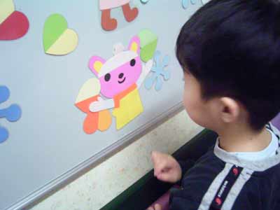 それでもまだ薬が来ないので、廊下で待機。 マグネットで遊ぶ。 |