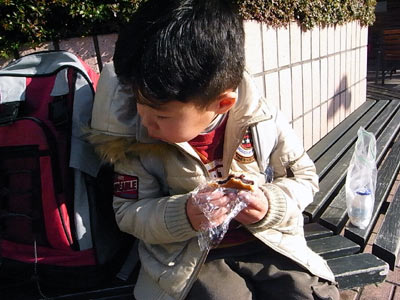 そしてすぐに栄養補給のおやつ。 ハトがSのアンパンを狙っており、 気になるS。 昔、カラスにおにぎり取られたしな・・・。 |