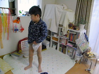 起きがけのS。 相変わらずオムツはズッシリ重い。 |