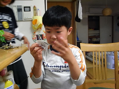 ゴミ箱にドラえもんのシールが捨てられているのを、 Sが発見。 おママが間違えて捨ててしまったのだ。 |