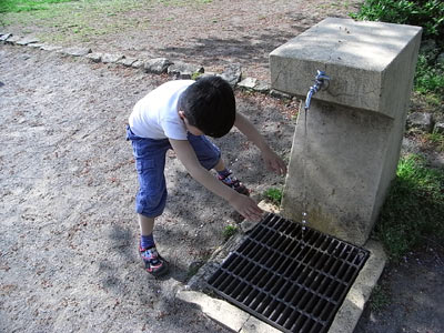 へっぴり腰で手を洗い、おやつにする。 |