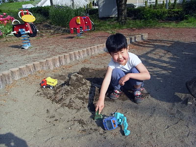 その後は大好きな砂遊びに興じる。 山を作って、最後に乾いた砂でデコレーション。 ケーキのようだ。 |