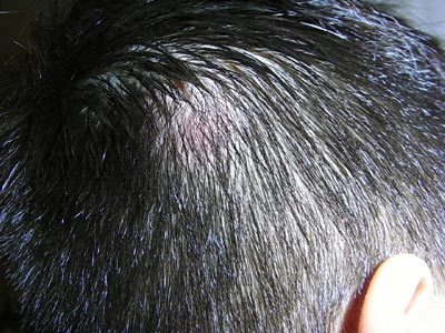 たんこぶ部分の毛が立つほど腫れている。 |