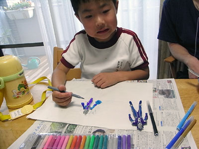 Sがおママに折ってもらったクワガタの折り紙に、足を貼っていた。