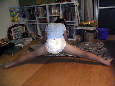 しかし、その前にストレッチ。 オムツなのは風呂上がりだから。 ストレッチが上手くできたらクワガタ見よう、 とエサで釣ると、 確かにいつもより良く広がっていた。 完全開脚もできるようになるかもしれない。 |