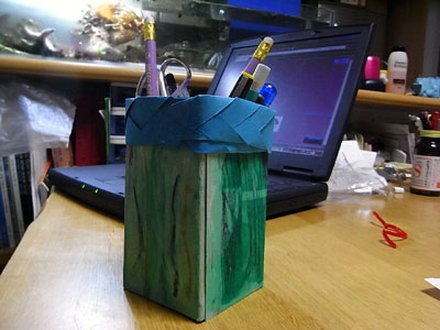 鉛筆立てだが、 三つ編み部分が一部二重に重なっている。 ながかったけど、この色があうとおもったから! あくまで自分のガサツさを肯定するS。 |