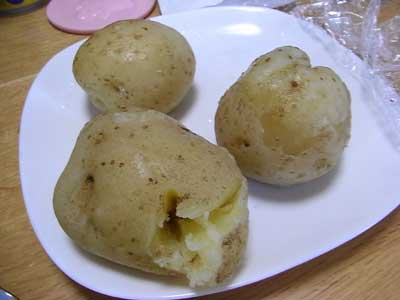 早速獲物を蒸かす。 穴ぼこはおパパが写真より先に手を出してしまったから。 |