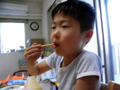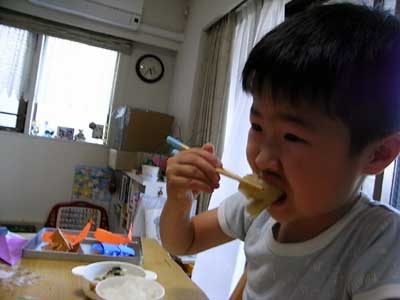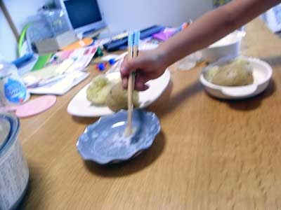 Sも箸を伸ばす。 ホンの一カケ、僅かなのは、 先日ジャガイモの煮物が口に合わなかったから。 |