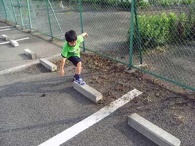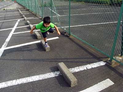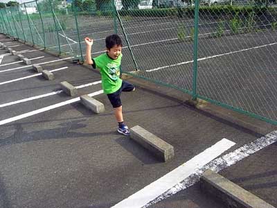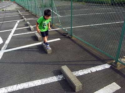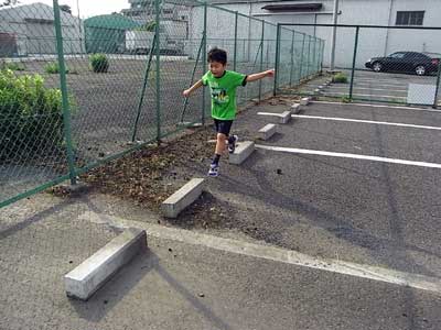 空き駐車場の車止め。 ここを飛び移るのだ。 |
