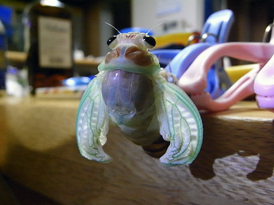 私の用意が悪く、足場が不安定、 落下してしまった個体。 しかし持っている間にもどんどん抜けてきて。 生命の力強さが指先から伝わってくる。 |