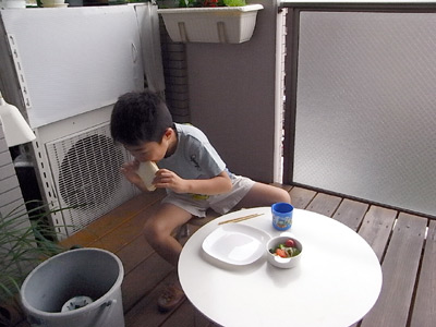 昼食時にはすっかり復活。 セミがとびたつ(飛び立つ)ところ、みたい! と、S1人、昼食はベランダとなった。 |