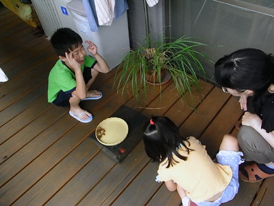 ご近所さんが遊びに来た。 Sは自慢のカエルを見せていた。 |