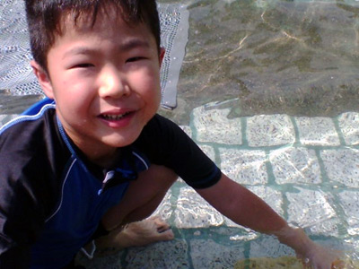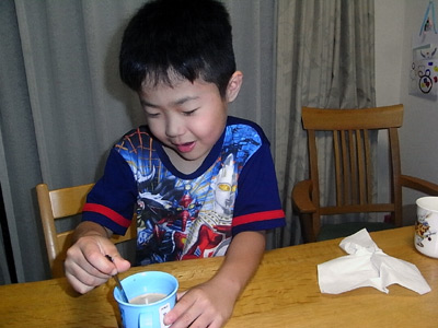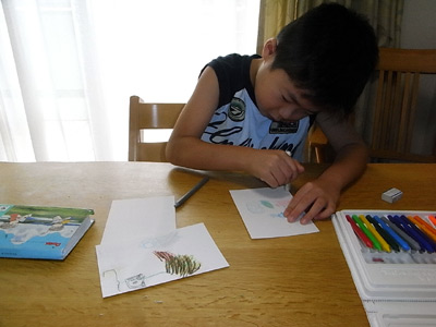 園からの暑中お見舞いのお返事。 先にクレヨンで絵を描いておいて、 その上から絵の具を塗る「弾き絵」だ。 |