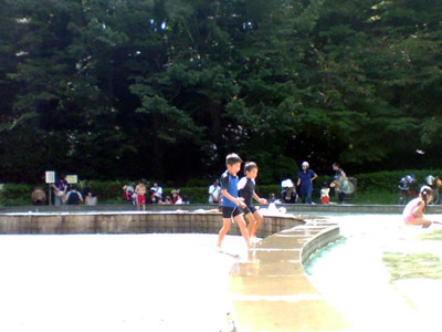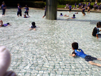 浅いプールのような噴水。 子ども達の良い遊び場となる。 |