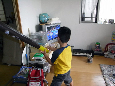 甲子園の決勝戦、Sも応援。 Sにはバットが剣に見えるのか? |