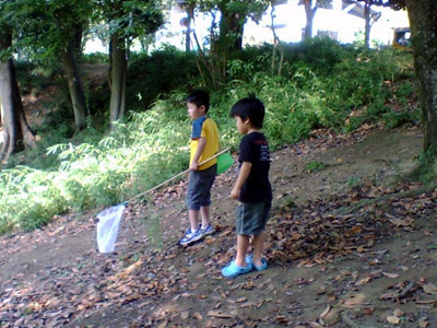 ECCの後は、公園で虫採り。 まぐれで網に入っても、 取り出すときに逃げられる。 |