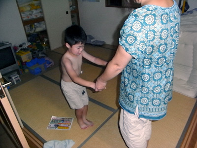 2、で閉じる。 3はその逆。 手を握ってリズムをとってやると、 それなりに。 おママは「初めてSと踊れた!」と大喜び。 たった、これだけ。 僅かこれだけ。 「これだけ」にSは一つ一つ確実にケッ躓くのだ。 |