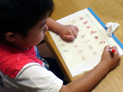 クリアフォルダに入れた見本、 ホワイトボードペンで何度も練習。 |