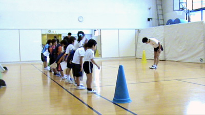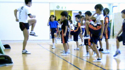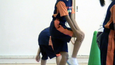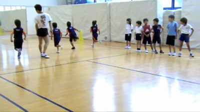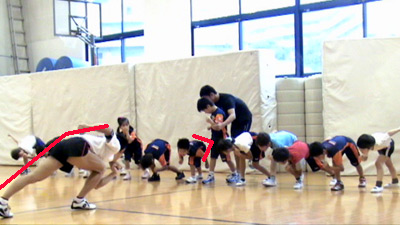 膝を高く上げるように、ストレッチ。 やはりSはバランスを崩してしまう。 膝を上げるのが苦手なのである。 |
