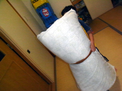 足で持ち上げる、腕の引きつけ、胸に乗せる。