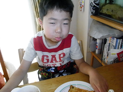 ライダーベルトで朝食を。 間抜けヅラのS。 |