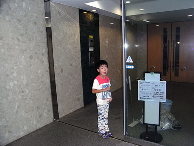 内外の境に立って、ガラス扉が閉まらないように。 |