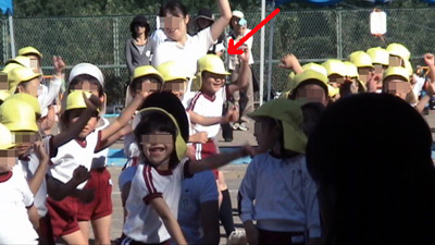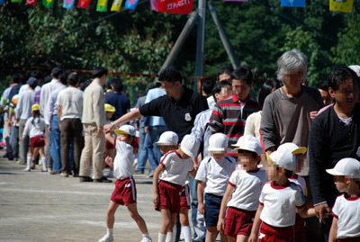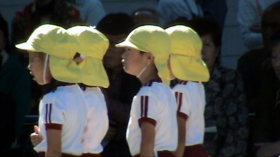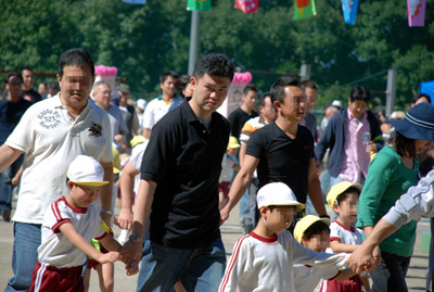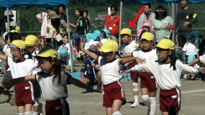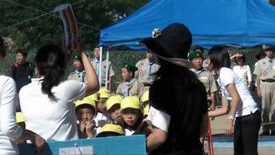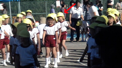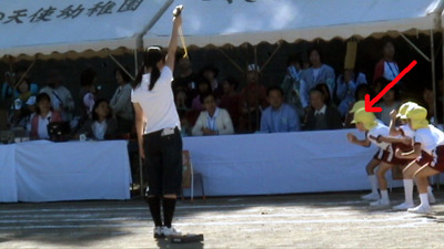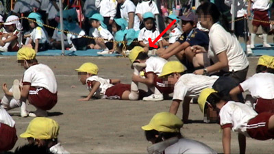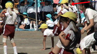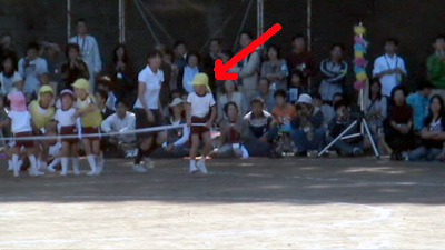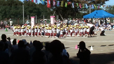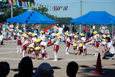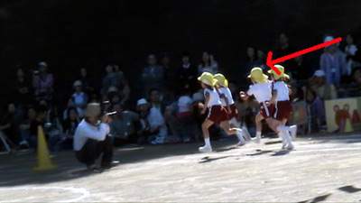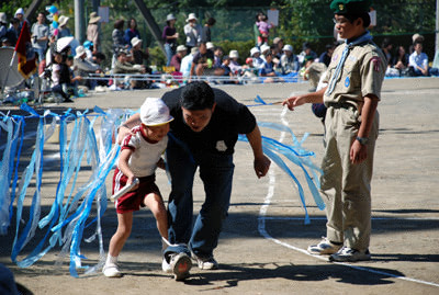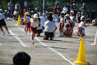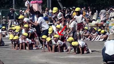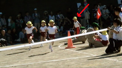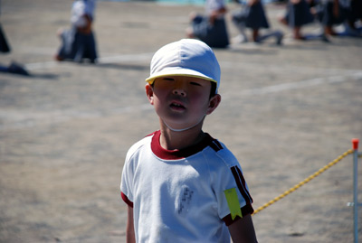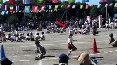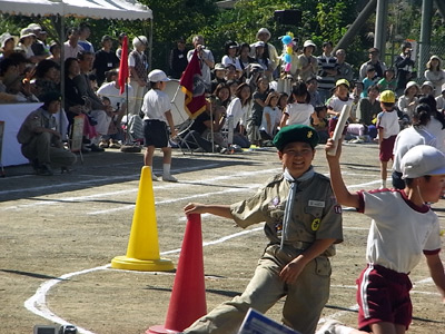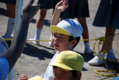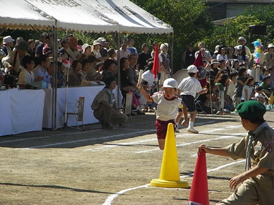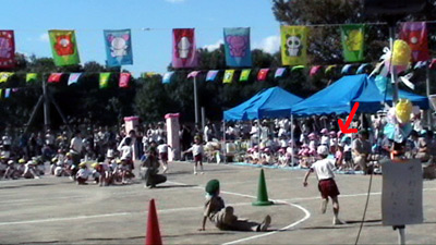 最初は年中の駆けっこのお手伝い。 Sがこの日一番楽しかったという、ゴール係である。 |