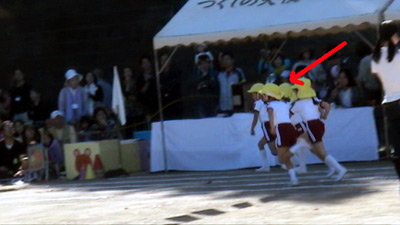 バトンを挙げっぱなしで走るS。