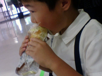 待ちの空腹を満たす、メロンパン。 チョコチップ入りが購入の決め手となった。 |