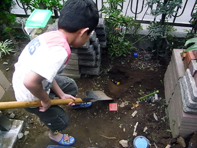 長生きだったカブトとノコギリも、 ついに寿命が尽きてしまった。 気軽に土に返せるのは、戸建てならでは。 |