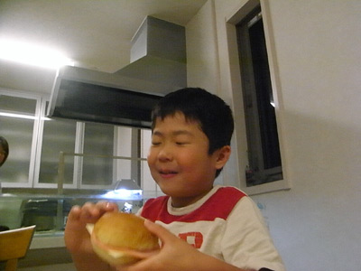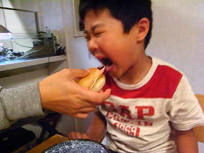 Sの食欲凄まじく、 今日も晩ご飯後に追加のパン。 |