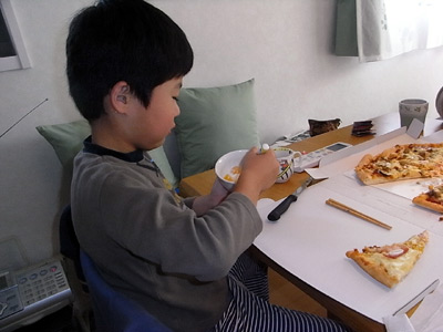 昼は大好きなピザ。 おママは栄養を考え、 ここで先にフルーツとヨーグルトを与える。 |