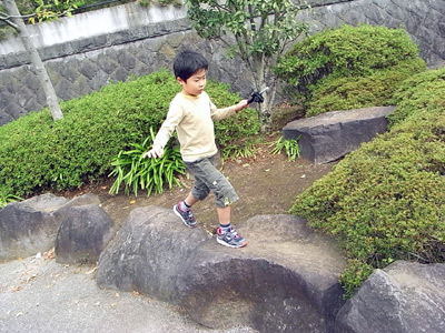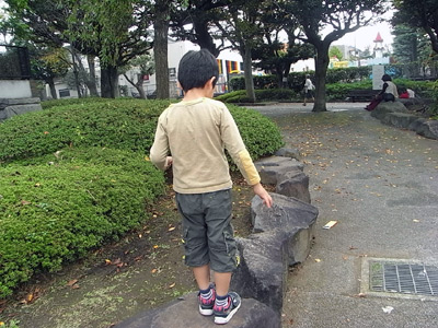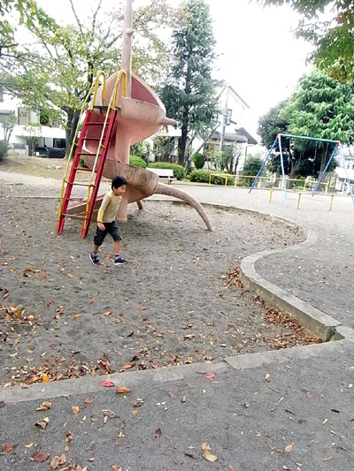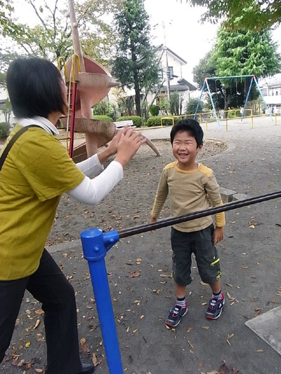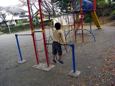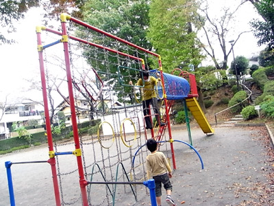 大きな遊具、おママが誘うが、 さすがに怖がって上がってこない。 |