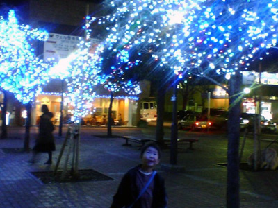 駅前がライトアップ。 |