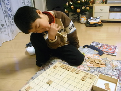 私が勝ってしまうと、拗ねてしまった。 「褒めて伸ばさねば」というのはわかるが、 勝負の世界では難しい。 |