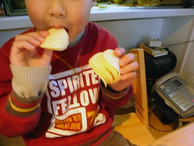 続いてポテチ。 滅多に食べさせない、 余程美味しかったのか鷲掴みで確保。 |