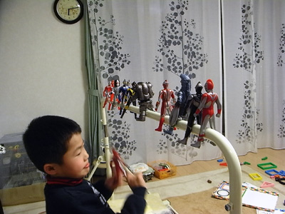 鉄棒も、すぐに別の遊び道具になってしまう。 勘弁してくれ、S。 |