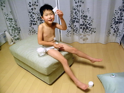 さすがにソファーで生ケツは禁止にした。 ムツ座りで胃ロウのガーゼを装着するS。 |