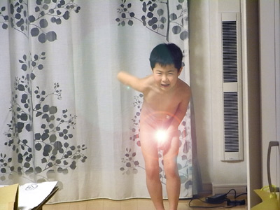 早速自宅ネブライザー。 手をブンブン振っている。 |