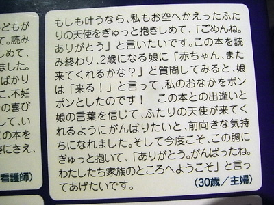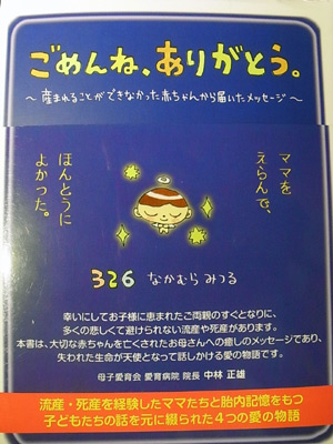 こういう本がある。 実は・・・。 私たちには再び新しい命が授けられていた。 しかし今回も前回同様に出血が見られていた。 成長が危ぶまれていたが、 今日体調に異変を生じて受診したところ、 やはり大きくなっていないと・・・。 その筋のクリニックだけあって、 診察室の横には泣き部屋があるそうだ。 「何で?!」「またか・・・。」 胎児が小さく掻爬はおそらく不要とのことだが、 悲しみはそれに比例しない。 むしろ落胆と焦りは今回が上かもしれない。 |