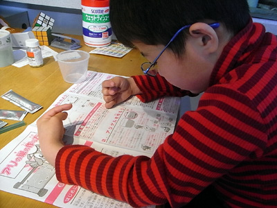 夕方、かねてから欲しがっていた、アリの観察セットを組む。