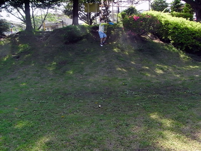 こんな斜面を駆け下りるながら投げるS。 |