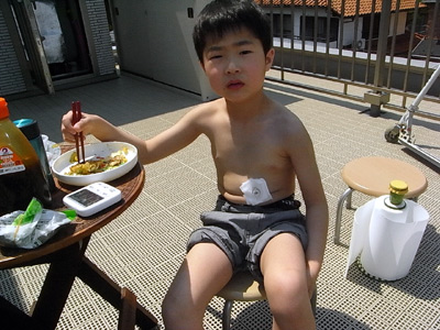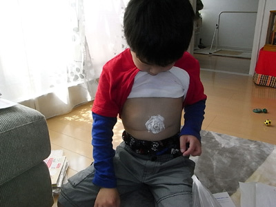 胃ロウのガーゼが取れてしまったので、 再度付け直す。 亜鉛華軟膏をべっとりとつけるS。 服に付くと落ちねぇんだよな、それ・・・。 |