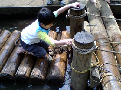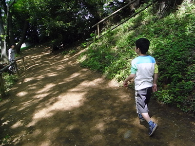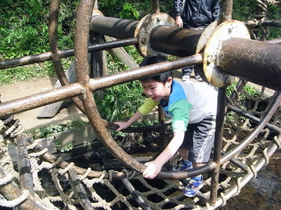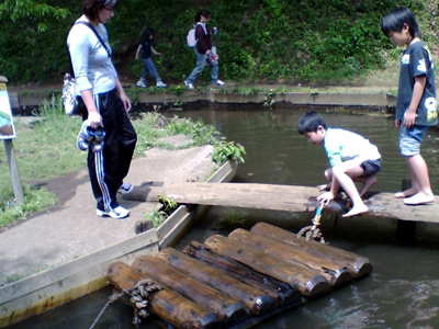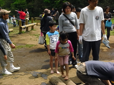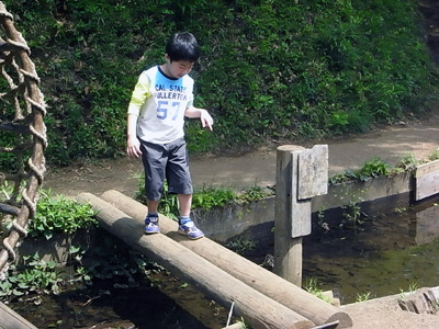 そんな所、Sが近寄るはずもなし。 というか、こんな丸太橋でさえ、 怖がって渡ろうとしなかった。 何度か手を引いた後の写真。 |