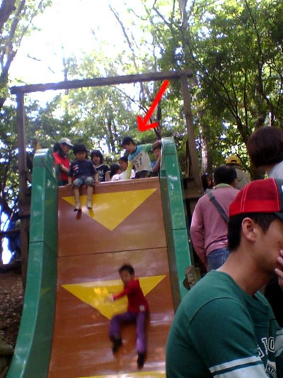 すべりだいなら! 鼻息荒く登って行ったSだったが、 滑り台とてフリーフォール系の激しいもの。 大丈夫か・・・? 案の定、敵前逃亡で引き返してくるSであった。 |