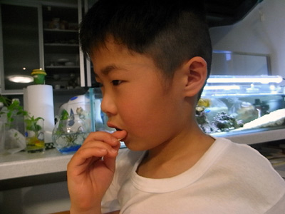 人生初の爪楊枝。 鳥食べたら、スキッ歯に仰山挟まったようだ。 未だ乳歯が生え替わる気配なし。 全ての発達が遅いSである。 |