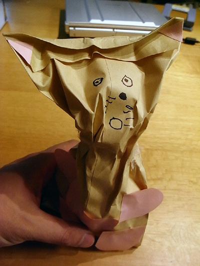 紙袋猫。 何とも味のある顔ではないか。 Sは小学校でやったことをすぐ家でやるそうである。 復習?なのだろうか。 |