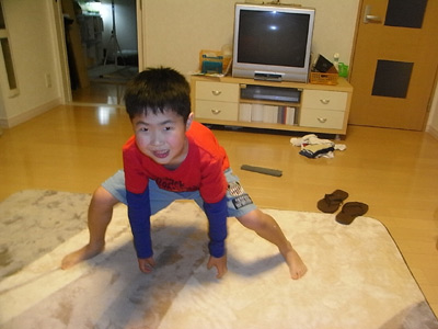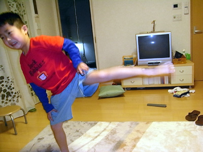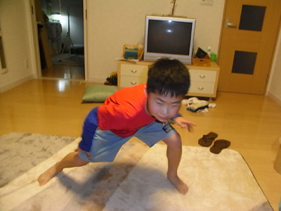 振り足跳び。 集中すると舌が出る。 |