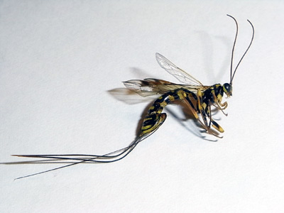 細長い卵管で木の幹の中にいる芋虫に卵を産み付ける、寄生蜂。
