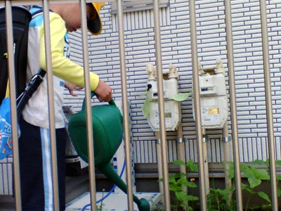 朝のひまわりへの水やり。 |